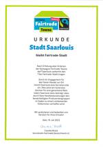 Die Stadt Saarlouis erfüllt weiterhin alle fünf Kriterien der Fairtrade-Towns Kampagne und trägt für weitere zwei Jahre den Titel Fairtrade-Stadt. Die Auszeichnung wurde erstmalig im Jahr 2009 durch TransFair e.V. verliehen. Seitdem baut die Kommune ihr Engagement weiter aus.