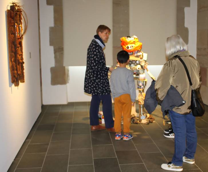 Besuchergruppe vor dem Kunstwerk "Müllmann" - einem Assemblage aus verschiedenen Materialien. Materialien gesammelt von Clean up-Saarland zusammen mit Daniel Boost