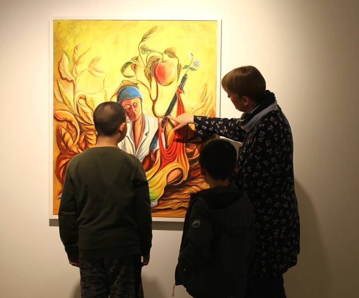"Ich sehe was, was du nicht siehst“, lautete ein Wissensspiel an diesem Tag. Gemeinsam mit dem Kooperationspartner "Netzwerk Entwicklungspolitik im Saarland e.V." (NES) wurden viele der ausgestellten Kunstwerke von den anwesenden Besucher_innen besprochen. Dabei ging es unter anderem um die UN-Nachhaltigkeitsziele Klimawandel, hochwertige Bildung, Nachhaltigkeit, Frieden und Gerechtigkeit oder auch den nachhaltigen Konsum und Produktion.