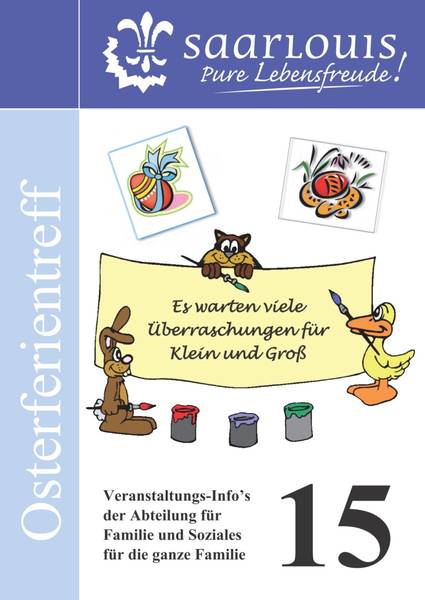 Die Kreisstadt Saarlouis, Abteilung Familie und Soziales, führt in Zusammenarbeit mit verschiedenen Freien Trägern, sozialen Einrichtungen, Bildungsträgern und Vereinen auch in diesem Jahr ihren traditionellen Osterferientreff durch. Vom 27. März bis zum 18. April können Jung und Alt zwischen unterschiedlichen Angeboten und Aktionen wählen.
