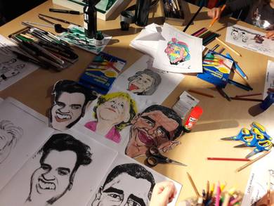 Zusätzlich konnten sich alle Besucher des Tages unter fachlicher Anleitung ihre eigenen Karikaturen erstellen. Wer mochte konnte vorgefertigte Gesichter berühmter Persönlichkeiten ausmahlen, welche kurzerhand zu lustigen Masken umfunktioniert werden konnten. Passend zur Ausstellung wurden bei der traditionellen Fotoaktion "Von der besten Seite" die Gesichter der abgelichteten Personen lustig verzerrt und nach Wunsch in verschiedenen farblichen Variationen ausgedruckt. Diese Eindrücke durften nach dem Digitaldruck kostenlos zur Erinnerung mit nach Hause genommen werden.