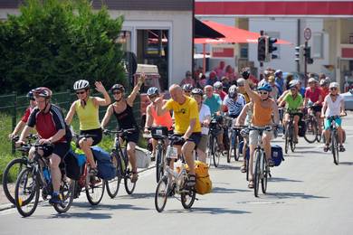 Bildunterschrift: Die Teilnehmer*innen der „Tour de Fair“ radeln für den Fairen Handel. (Bild: Gerhard Werum)