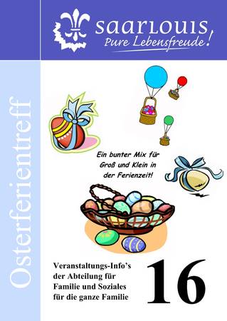 Die Kreisstadt Saarlouis, Abteilung Familie und Soziales, führt in Zusammenarbeit mit verschiedenen freien Trägern, sozialen Einrichtungen, Bildungsträgern und Vereinen auch in diesem Jahr ihren traditionellen Osterferientreff durch. Vom 24. März bis zum 10. April können Jung und Alt aus einem bunten Mix unterschiedlicher Angebote und Aktionen wählen.