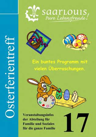 Vom 8. bis zum 23. April finden im Saarland die Osterferien statt. In dieser Zeit führt die Kreisstadt Saarlouis, Abteilung Familie und Soziales, in Zusammenarbeit mit verschiedenen freien Trägern, sozialen Einrichtungen, Bildungsträgern und Vereinen auch in diesem Jahr ihren traditionellen Osterferientreff durch. Neben dem Kreieren farbenfroher Osterdekorationen stehen viele weitere abwechslungsreiche Angebote und Aktionen für jedes Alter auf dem Plan.