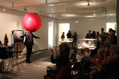 Neben der Ausstellung selbst wurde den Kindern ein abwechslungsreiches Rahmenprogramm angeboten. Wer wollte konnte sich in der Kreativwerkstatt des Museums mit Buntstiften seine eigenen Bestecke designern. Für eine zauberhafte Show sorgte Maxim Maurice, welcher wieder einmal mit seinen Tricks Groß und Klein in seinen Bann zog. Wer süßes will muss leiden, könnte man das Glücks- und Geschicklichkeitsspiel nennen, welches an diesem Nachmittag für reichlich Stimmung sorgte. Mit Hilfe von Messer, Gabel, einem Würfel, Handschuhen, Mütze und Schal ging es darum, Stücke aus einer Schokoladentafel zu brechen, aufzuspießen und zu genießen, bevor ein anderer Spieler sich an die süße Beute zu schaffen macht. Bei der traditionellen Fotoaktion "Von der Besten Seite" konnten sich die fast 100 Besucher_innen vor einer Lokalität ihrer Wahl ablichten lassen, welche etwas mit dem Thema Essen zu tun hatte. Durch die nachträgliche digitale Bilderbearbeitung sahen die ausgedruckten Farbfotos verblüffend echt aus. Diese Eindrücke konnten nach dem Druck kostenlos zur Erinnerung mit nach Hause genommen werden. Im Museumscafé sorgte das Team vom Museum mit fair gehandelten Produkten für das leibliche Wohl. Ergänzt wurde das Angebot durch eine Kuchenspende der Firma Globus aus Saarlouis.