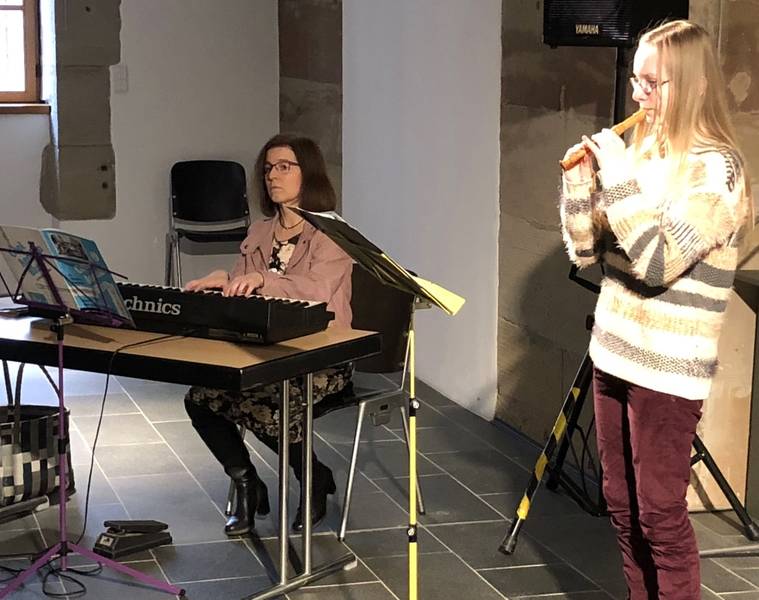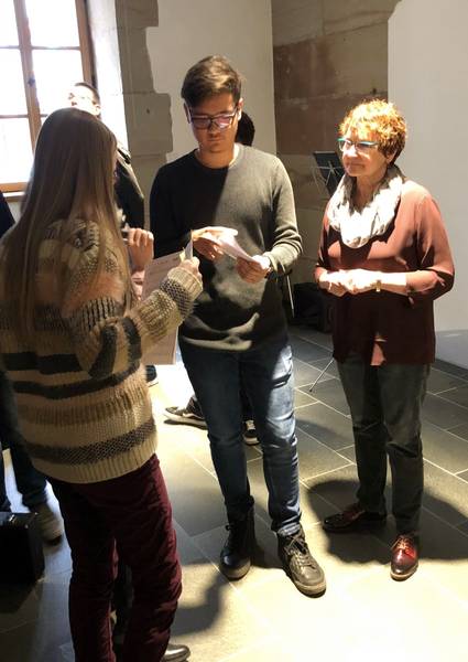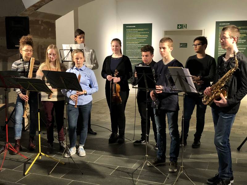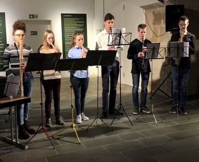 Ein junges Publikum eroberte die Galerie. So gestaltete das kulturelle Programm die Instrumental AG des Gymnasiums Am Stadtgarten (SGS) unter der Leitung von Ute Heupel-Löw. Sie lud die mehr als 100 Besucher_innen auf eine musikalische Reise ein. Die Schüler_innen Sophia Schmitt, Johanna Löw und Sophie Castor musizierten mit ihren Alt - Blockflöten. Niklas Marion spielte Saxophon, Simon Marion und Linus Aliani jeweils Klarinette, Alessia Licata die Geige. Durch das Programm führten die Schüler Till Brömer und Simon Spinuso.