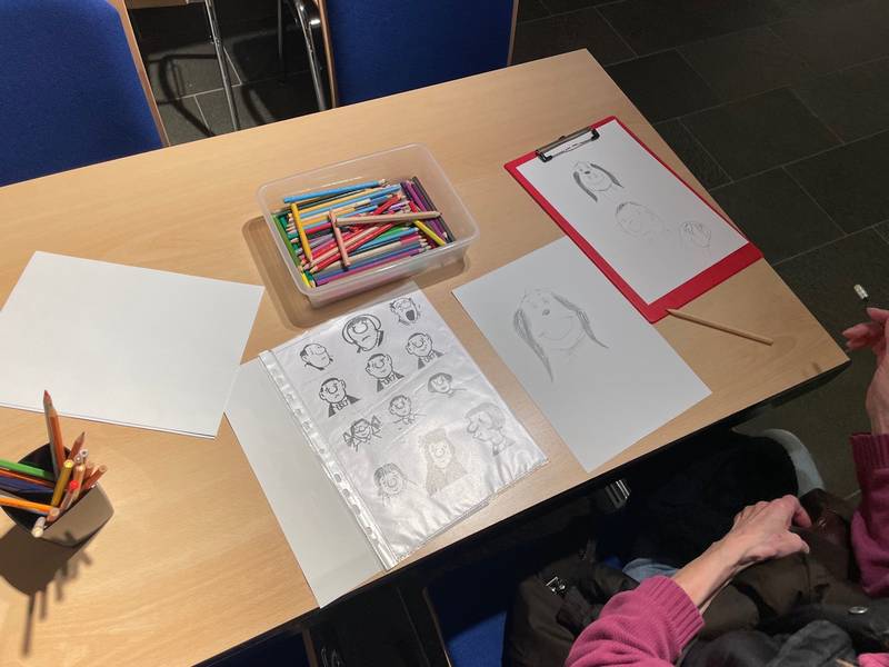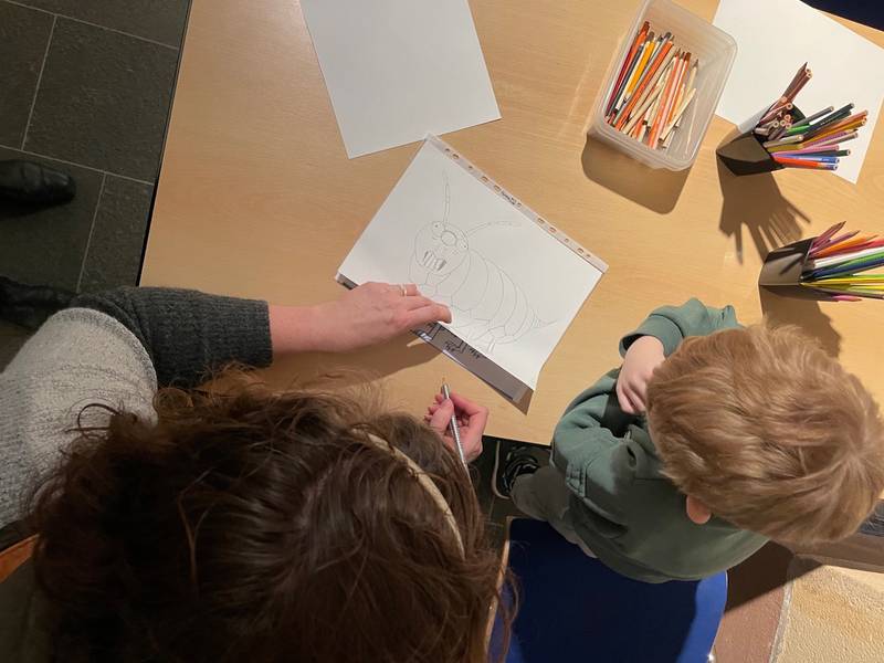 Groß und Klein experimentieren auch am Kreativtisch mit Farbstiften, um sich im Zeichenstil von Loriot zu probieren. Lieblingsfiguren an diesem Nachmittag waren „Wum“ oder auch die gefräßige „Steinlaus“.