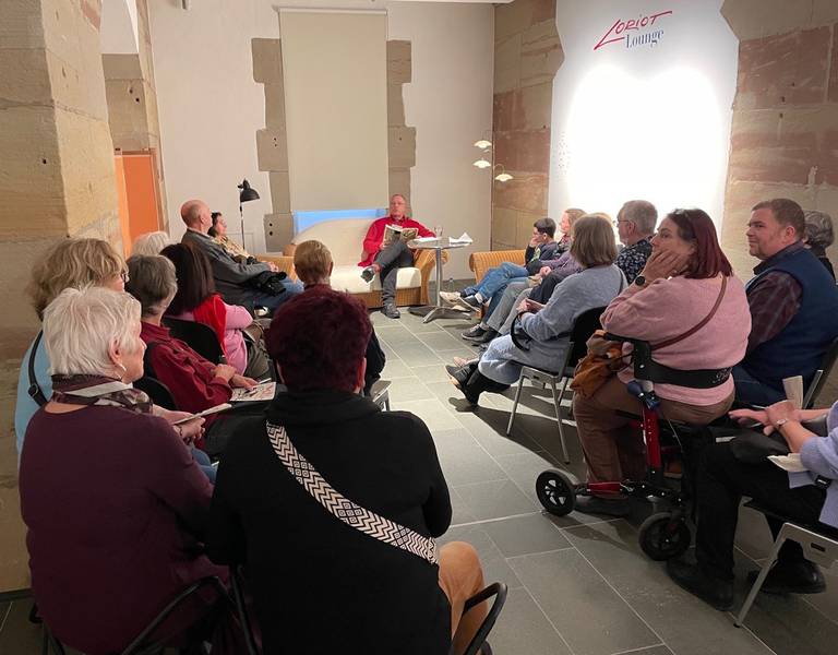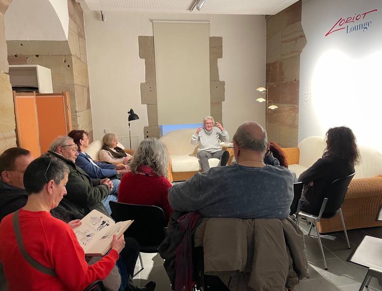 Nahtlos ging das Programm an diesem Nachmittag über in den Gesprächskreis von Irene Portugall. Viele Besuchende hatten sich in der Loriot Lounge eingefunden, um mit Irene Portugall über das Thema „Loriot und die Frauen“ zu diskutieren. Einige der Teilnehmenden machten sich dann anschließend auf Spurensuche nach typischen Geschlechtsmerkmalen in den weltberühmten Cartoons von Loriot mit seinen typischen Knollennasenfiguren.