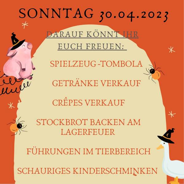 Hexennacht mit tierischem Spass am Sonntag, den 30. April 2023, in der Zeit von 15.00 bis 18.00 Uhr