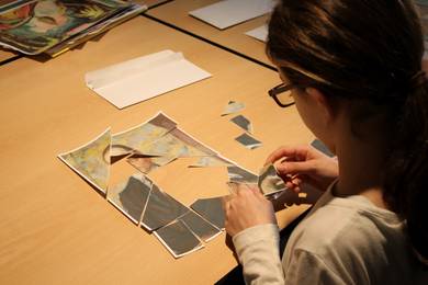 Zu Ludwig´s Kids-Treff wurden verschiedene Puzzle mit Abbildungen der Ausstellungsbilder erstellt. Je nach Alter konnten sich die kleinen Besucher ihre Schwierigkeitsstufe auswählen. Nach Zusammenstellung des Puzzles musste das Original in der Ausstellung gesucht und alle Informationen zum Bild zusammengetragen werden. In einem anderen Spiel wurde mit einem Foto-Memory das Gedächtnis der Besucher auf die Probe gestellt. Mit Farbe, Pinsel und fachlicher Anleitung wurden an diesem Nachmittag zahlreiche farbenfrohe Bilder von den kleinen Galeriebesuchern erstellt. Das Malangebot wurde von der Kath. Familienbildungsstätte Saarlouis durchgeführt.