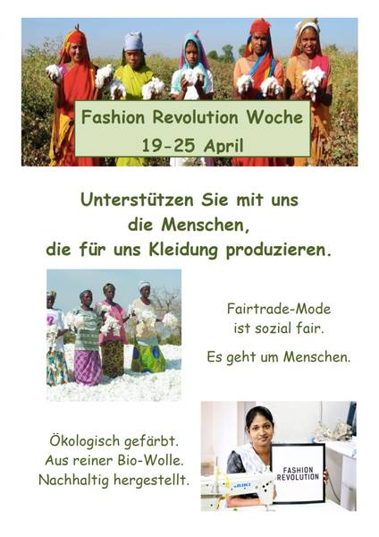 Hier geht es um Flyer "Unterstützen Sie mit uns die Menschen, die für uns Kleidung produzieren" sowie nähere Informationen zur "Internationalen Fashion Revolution Woche vom 19. bis 25. April, und warum diese in genau dieser Woche gefeiert wird".