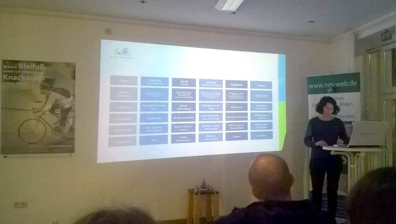 Mit dem Klimabündnis stellte Referentin Silke Lunnebach an diesem Abend ein europaweites Projekt vor, welches mit einzelnen Kampagnen auf visuelle und nachdenkliche Art und Weise auf den Klimaschutz aufmersam macht. Seit 25 Jahren steht dieses Bündnis für einen ganzheitlichen Ansatz im Klimaschutz. Mit ihrem Beitritt zum Klima-Bündnis haben sich bislang mehr als 1.700 Städte, Gemeinden und Landkreise in 25 europäischen Ländern dazu verpflichtet, ihre Treibhausgasemissionen vor Ort zu reduzieren. Mit Plakaten, Postkarten oder Swing Cards für öffentliche Verkehrsmittel werden den Mitgliedern Kampagnenelemente an Hand gegeben, die zum Nachdenken anregen sollen.