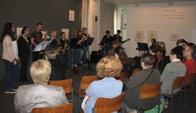 In einigen der Ausstellungsräume hatten die Besucher_innen im "Ludwig´s Kunst-Café" die Möglichkeit, gemeinsam bei einer Tasse fair gehandeltem Café und einem Stück Kuchen den Museumsflair auf sich wirken zu lassen. Musikalisch begleitet wurde dieser Nachmittag durch die Schulband "Max Teens" des Max-Planck-