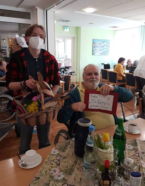 Paul Eisenbarth, FSJ´ler Diakoniekaufhaus war bei der Aktion dabei und hat die Osterkörbe mit den gebastelten Grüßen verteilt. Bild: Diakonie