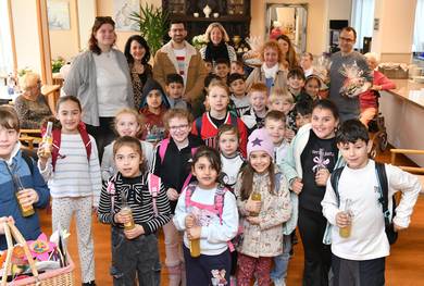 Schon von weitem hörte man fröhliche Kinderstimmen, die sich der „Seniorenresidenz“ der Arbeiterwohlfahrt im Prälat-Subtil-Ring näherten. Gemeinsam mit Schulleiter Stephan Heck statteten rund 25 Kinder der Grundschule Römerberg den älteren Herrschaften einen Besuch ab, um ihnen ihre Osterbasteleien persönlich zu überreichen. Edith Jarzombek, Leiterin der Einrichtung begrüßte die gut gelaunte Kinderschar mit ihren Lehrerinnen und Lehrern sowie die Vertreterinnen vom Amt für Familien & Soziales. Ihr besonderer Gruß galt Bürgermeister Carsten Quirin, der sich ganz herzlich bei der Fair-Trade-Steuerungsgruppe Saarlouis bedankte, die das Projekt vor einigen Jahren ins Leben gerufen hatte, sowie bei den Kindern für die tollen Basteleien.