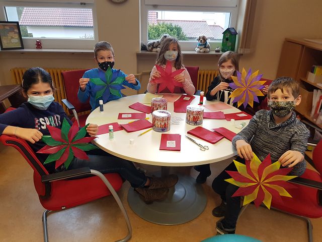 Dazu werden derzeit unter der Anleitung von Frau Waschbusch, Herr Heck und Frau Klein fleißig Transparentsterne zur weihnachtlichen Fensterdekoration gebastelt: 250 Stück an der Zahl. Die Faltsterne werden dann am 4. Dezember in einem Adventstütchen mit einem fair gehandelten Schokoladengruß für alle Bewohner und Mitarbeiter in der Einrichtung abgegeben.