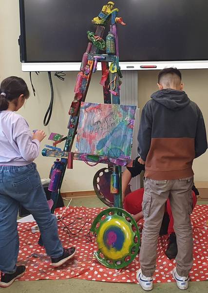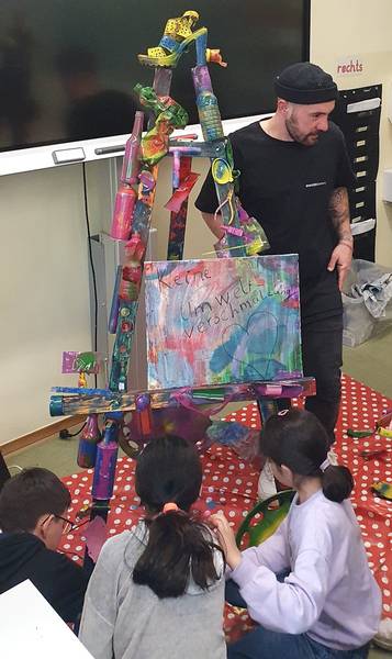 Um auch andere Kinder der Schule für Müllvermeidung und -Recycling zu sensibilisieren, bemalten die Schülerinnen und Schüler der Klasse 4.1 die Gegenstände kunstvoll. Kleine und größere Gruppen zeichneten auf Leinwänden Logos gegen Umweltverschmutzung und tauschten ihre Ideen aus. Die mitgebrachte Staffelei von Daniel Boost verwandelte sich den Vormittag über in eine beeindruckende Skulptur zum Thema „Umweltschutz“, die nun in der Römerbergschule ausgestellt wird.
