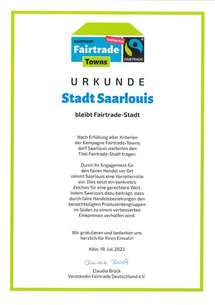 Seit dem 19. Juli 20211 ist Saarlouis bereits zwölf Jahre Fairtrade-Stadt. Nach Erfüllung aller Kriterien der Kampagne Fairtrade-Towns, darf Saarlouis für zwei weitere Jahre den Titel "Fairtrade-Stadt" tragen.