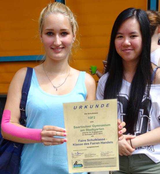 Zum Ende des Schuljahres 2013/2014 vergab die Fairtrade Initiative Saarbrücken zum vierten Mal die Auszeichnung "Faire Schulklasse - Klasse des Fairen Handels". Bei dem grenzüberschreitenden Wettbewerb setzte sich unter anderem die Klasse 10F2 des Gymnasium am Stadtgarten Saarlouis durch. In einer Feierstunde wurden die fairen Urkunden von dem saarländischen Bildungsminister Ulrich Commerçon übergeben.