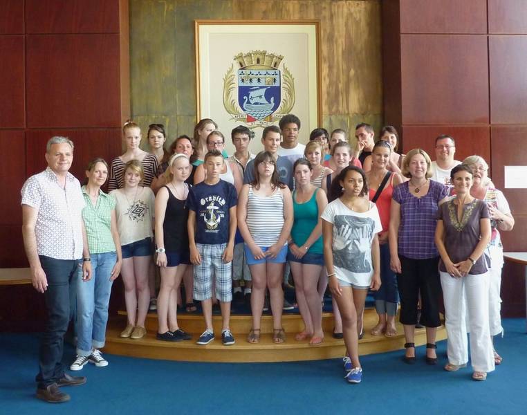 Eric Provost, Beigeordneter der Stadt Saint-Nazaire (ganz links im Bild), das Commité de Jumelage und die Direktorin von OMJ (rechts im Bild) begrüßten die Jugendlichen im Rathaus von Saint-Nazaire.