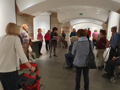 Zu Beginn begrüßte die Seniorenbegleiterin Gaby Böhme die Gäste herzlich. Als Einstimmung auf das Ausstellungsthema las Brigitte Bilz die antike Sage von Dädalus und Ikarus vor. Im Anschluss führte Frau Durand-Block die Teilnehmer durch die Ausstellung und stellte die Werke von Ernst Alt vor, die direkt auf die vorgelesene Geschichte Bezug nehmen.