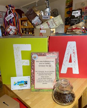 Am heutigen Tag des Kaffee spendete die Faire Kreisstadt Saarlouis anlässlich des 10-jährigen Jubiläums als Fairtrade City allen Besucher*innen im Laden La Tienda einen fair gehandelten Kaffee sowie stellte drei Preise für das Schätzspiel zur Verfügung.
