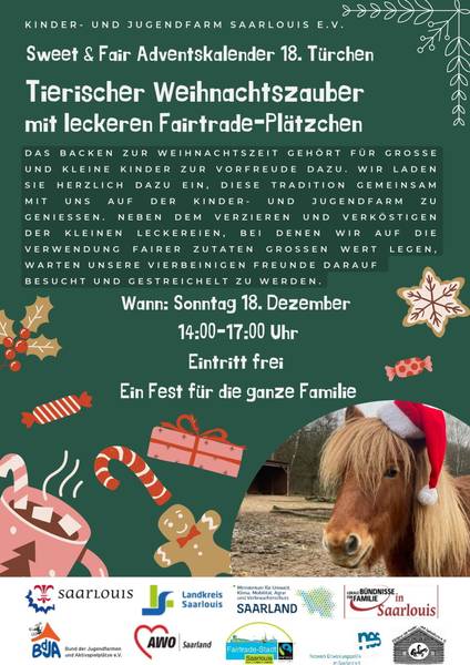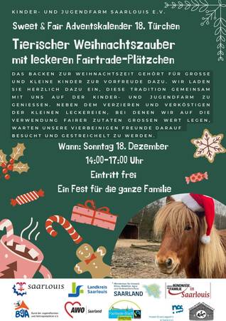 Das Backen zur Weihnachtszeit gehört für große und kleine Kinder zur Vorfreude dazu. Das Team der Kinder- und Jugendfarm Saarlouis lädt herzlich dazu ein, diese Tradition auf der Kinder- und Jugendfarm zu genießen. Neben dem Verzieren und Verköstigen der kleinen Leckereien, bei denen auf die Verwendung fairer Zutaten großer Wert gelegt wird, warten die Vierbeinigen Freunde darauf besucht und gestreichelt zu werden. Der Eintritt ist frei.
