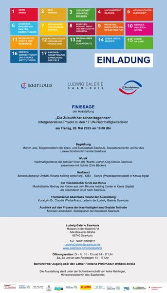 Am Freitag, 26. Mai 2023 geht dann die Ausstellung „Die Zukunft hat schon begonnen“ auch schon wieder zu Ende. Im Rahmen einer Finissage um 18 Uhr wird auf die Ausstellung zurückgeblickt. Nach der Begrüßung durch die Bürgermeisterin Marion Jost wird Benard Momanyi Ombati von der Projektpartnerschaft „Riruma helping center org - KISII – Kenya“ in Kenia digital ein Grußwort sprechen. Die Leiterin der Ludwig Galerie Saarlouis, Dr. Claudia Wiotte-Franz, wird über Bilanz der Ausstellung sprechen sowie der Sozialplaner der Kreisstadt Saarlouis, Michael Leinenbach, einen Ausblick auf den Prozess der Nachhaltigkeit und Sozialen Teilhabe gewähren. Musikalisch wird die Finissage von den Schüler*innen der Martin-Luther-King Schule Saarlouis zusammen mit hichris umrahmt, die ihren Nachhaltigkeitsrap erneut live aufführen werden.
