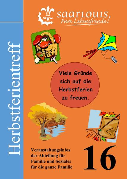 Die Kreisstadt Saarlouis, Abteilung Familie und Soziales, führt in Zusammenarbeit mit verschiedenen freien Trägern, sozialen Einrichtungen, Bildungsträgern und Vereinen auch in diesem Jahr ihren traditionellen Herbstferientreff durch. Über die Ferienzeit hinaus können Jung und Alt aus unterschiedlichen Angeboten und Aktionen wählen.