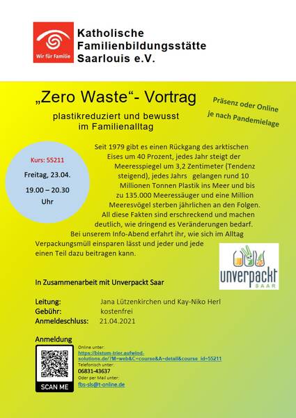 Vortrag als Präsenz oder Online am Freitag, den 23.4.2021 von 19.00 bis 20.30 Uhr. Anmeldung Online unter https://bistum-trier.aufwind-solutions.de/?M=web&C=course&A=detail&course_id=55211, Telefonisch unter 06831-43637 oder per Mail unter fbs-sls@t-online.de. Angeboten wird der Vortrag von der Kath. Familienbildungsstätte Saarlouis e.V. in Zusammenarbeit mit "Unverpackt Saar". Die Teilnahme ist kostenfrei.
